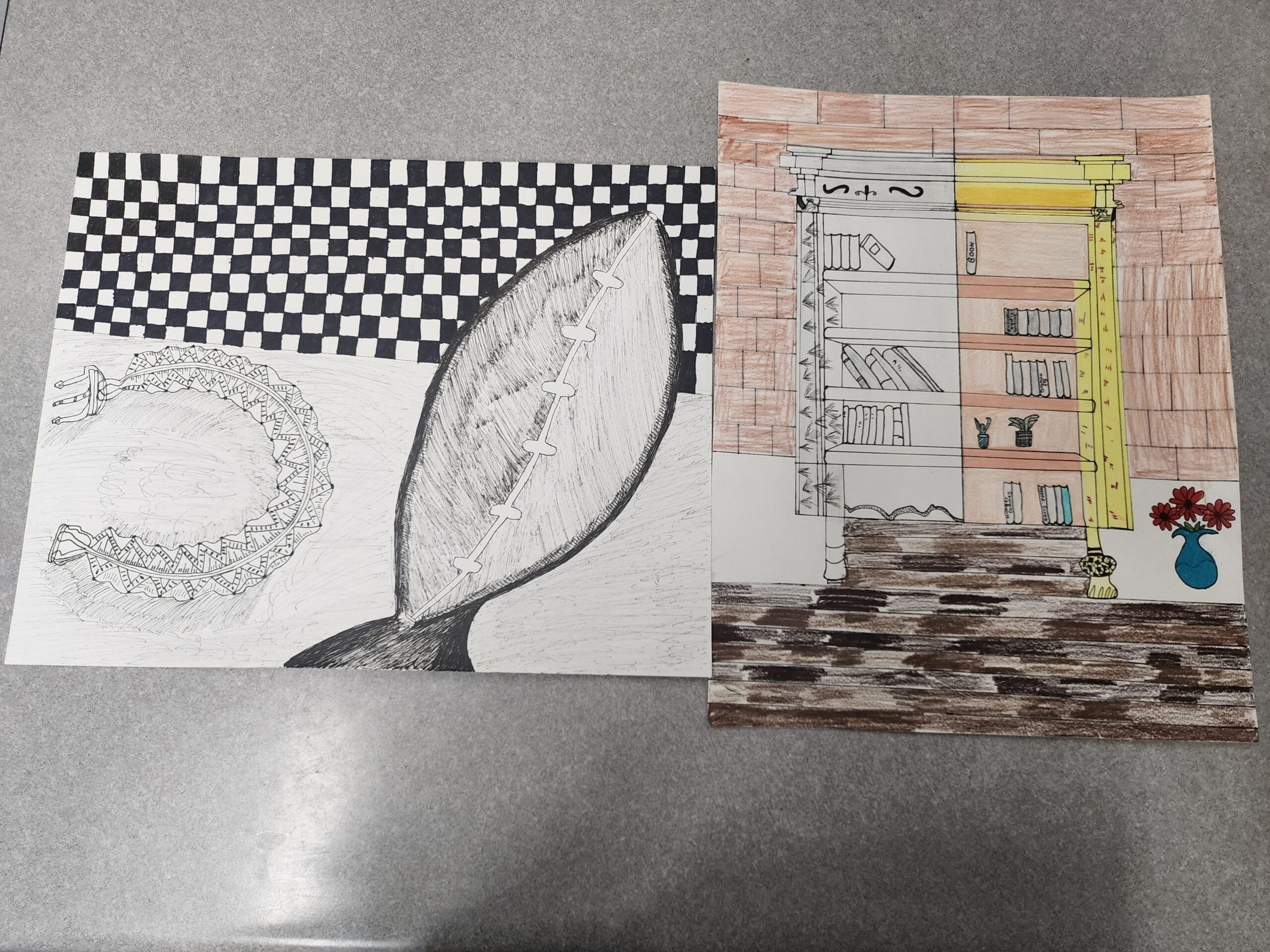 For this project, I wanted to draw objects that hold a special place in my life. The Italian bookshelf caught my eye because of its beautiful design and the way each shelf feels like its own tiny world. I loved capturing the details and textures that make it unique. The bracelet is especially precious to me—my sister made it for me at camp, and its light green color always reminds me of her kindness. It also matches my mom’s light green sweater, which I wear almost every day because it makes me feel close to her, like I’m carrying a little bit of home with me. The football was something simple I found in my drawing class, but adding it felt right—it reminds me that sometimes small, unexpected things become part of our stories. Together, these objects show the mix of family, memory, and little moments that mean the most to me.