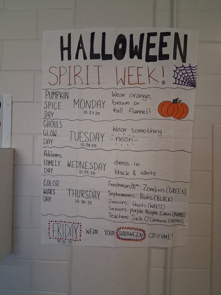 El lunes de Pumpkin Spice tuvo a los estudiantes vestidos con colores otoñales como naranja, rojo y marrón. El martes de Ghouls Glow fue el día neón, y el miércoles de Wednesday Addams animó a los estudiantes a vestirse de blanco y negro como el famoso personaje.